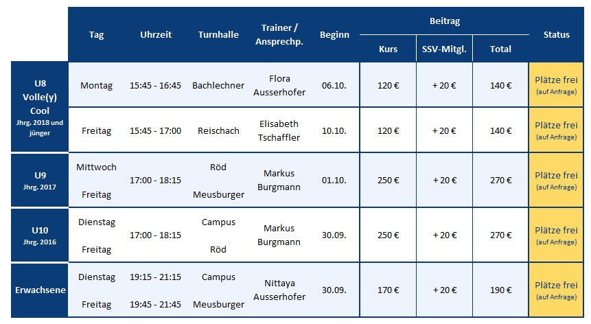 Sia per i giovani che per gli anziani. La sezione pallavolo della SSV offre un'ampia gamma di corsi. In questa pagina troverete tutti i corsi attuali in un colpo d'occhio e, soprattutto, potrete iscrivervi facilmente al corso che fa per voi con pochi clic. Si prega di notare, tuttavia, che la capacità per alcuni corsi non è data e quindi dovrete iscrivervi ai seguenti corsi
